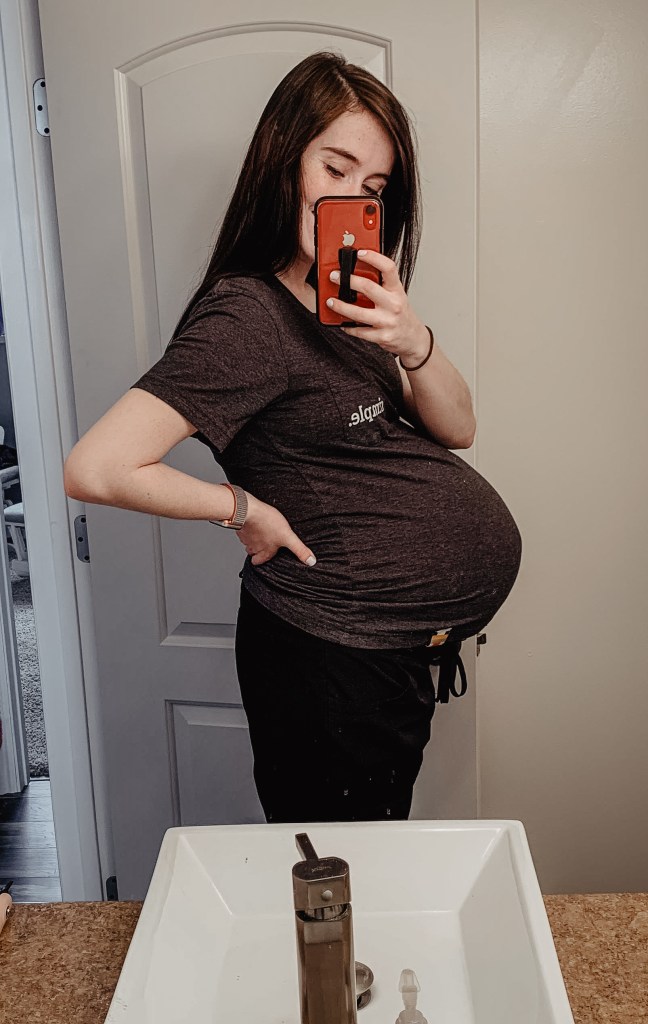 I continued going to work as normal. When I was about 36 weeks along, I switched from working “the back” as a medical assistant (going into rooms and assisting with exams and procedures) and switched to working “the front”, checking people in, managing paperwork, and answering the phones. I simply wasn’t able to be on my feet for full four hour clinic shifts anymore. My last day of work was my due date, and I remember people coming in for their appointments, checking in with me, and asking “OH WOW, when are you due???” and I would smile and say “Today.” It was pretty humorous to me at the time.