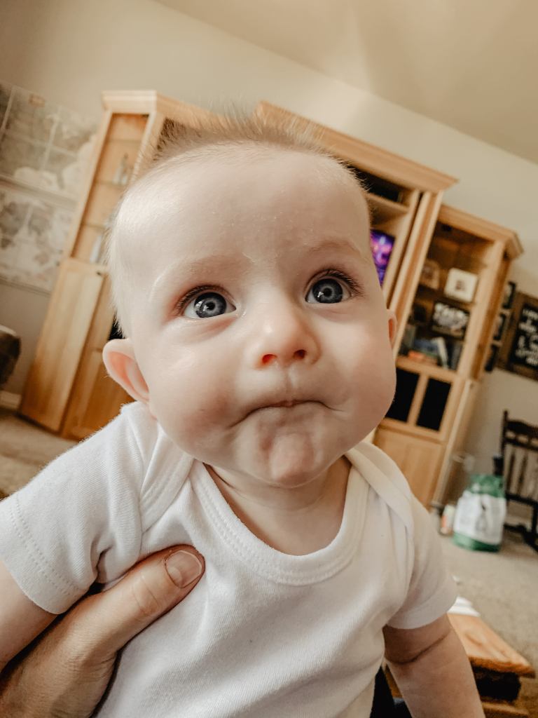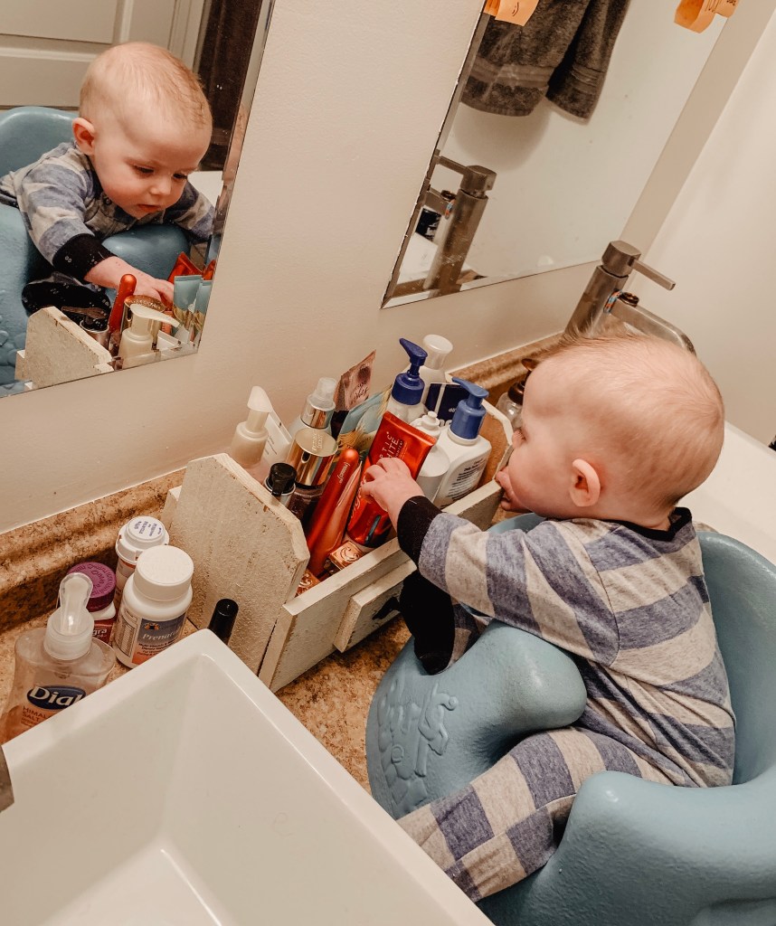 - Random Stuff in Your House – shoes, burp cloths, dog toys, kitchen tools, empty bottles, full bottles, hair ties, remotes, a dirty t-shirt, mom’s cell phone, socks, cups, boxes, literally anything in the pantry, the dog’s tail…the list could go on and on. I don’t know why, but my baby loves random stuff in our house. Sometimes when he’s fussy and bored, I’ll pick him up and we’ll just go stand in the pantry where he can see and touch all sorts of fun stuff. Do what you gotta do.