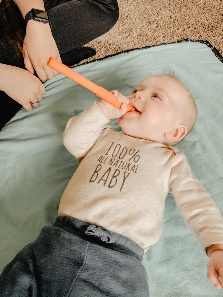 - Teething Tubes – these are currently Calvin’s favorite toy. Easy to grip, multiple textures, and super easy to clean and sanitize. I highly recommend these teething tubes.
