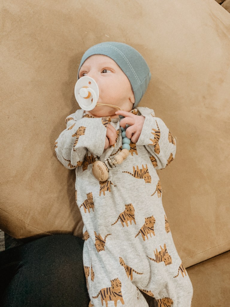 - 2-3 Pacifiers – some babies love pacifiers and some don’t care for them. I have a baby who loves his binky. I was determined not to give him a pacifier for 3-4 weeks so that we could establish breastfeeding. Here was the problem. Cal wasn’t a good nurser. He was a sleepy eater with a bad latch and didn’t comfort nurse. So by Day 4 of his life, he was given a binky and it made all of our lives much easier. Do what you think is best and tell the other opinions to suck it. You can get a pack of 4 Soothies for about $9.