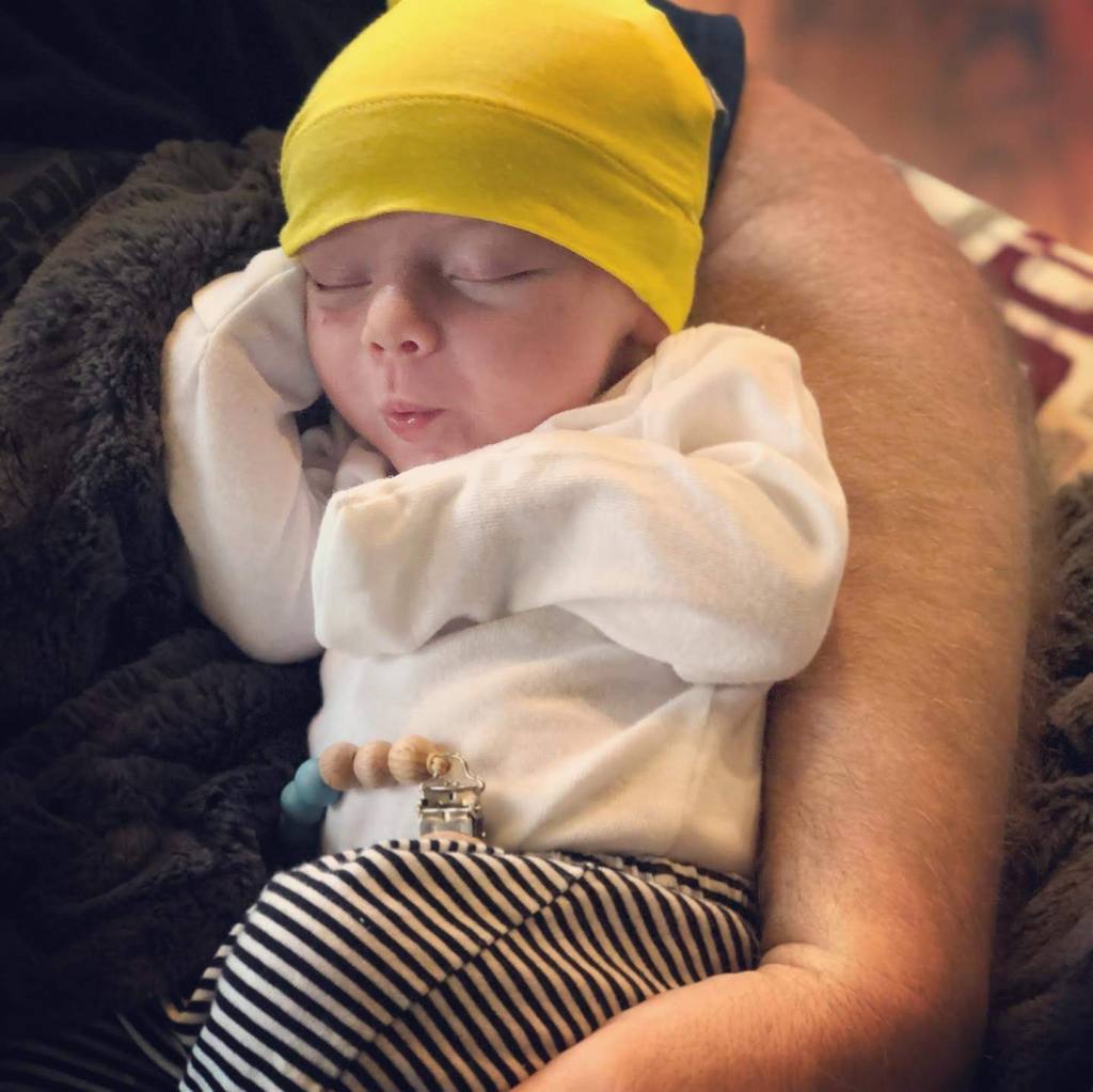 - 3 knotted beanies (for a winter baby) – we as humans lose the most heat through our heads and our feet. I loved these beanies because they’re soft, stretchy, and they stayed on his little hean. Plus you can move the knot to adjust the size. You can get a 3 pack for about $9 if you buy new.