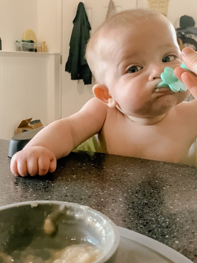 Now that Calvin is older, I don’t rely on freezing my food because he eats much more. Last time I prepared him some food, I made applesauce, sweet potato mash, and steamed baby carrots. I poured the apple sauce and mash into quart sized mason jars and put them in the fridge. Then I quartered the carrots lengthwise and put them in a glass container as well. All three of these things are great for me to reach for between meals and bottles when Cal needs a snack.