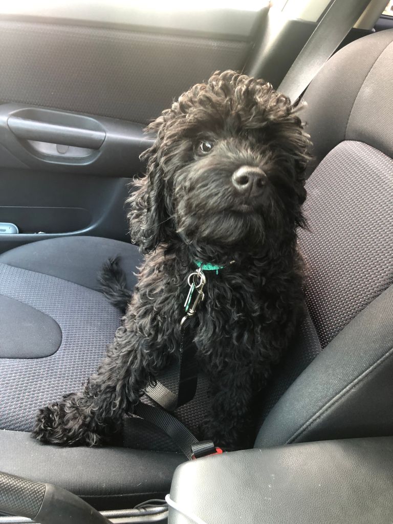 - Seatbelt – we use this seatbelt that clips to Lucky’s harness and clicks into a standard seatbelt fastener whenever Lucky is in the car. It keeps him on his seat (not roaming about the cabin), he knows when it’s car time, and in the event of a collision, Lucky would be protected from being ejected from the vehicle. His crate is far too big for him to ride in it in the car, so this was a wonderful option and Lucky does really well with it.