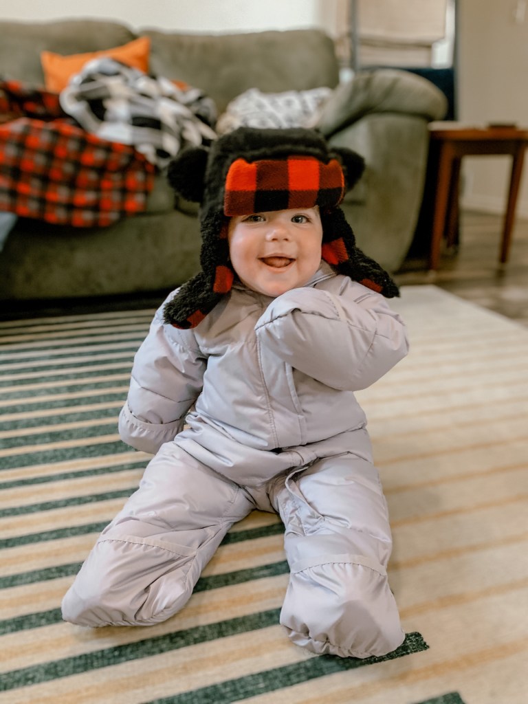 - Columbia Snuggly Bunny Bunting – I purchased this bunting during a sale and got it for 60% off, but I honestly think it would have been worth paying full price. I purchased the 6-12 month size and even though it was huge on him at 6 months, he wasn’t mobile yet so it didn’t really matter. This bunting will fit throughout the rest of the cold season, it’s easy to put on, keeps him toasty warm, and will hold up for future babies to use.