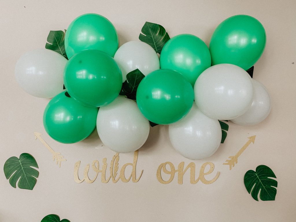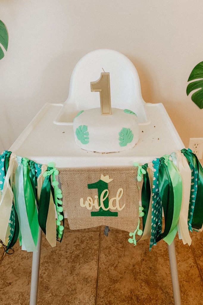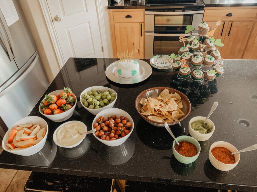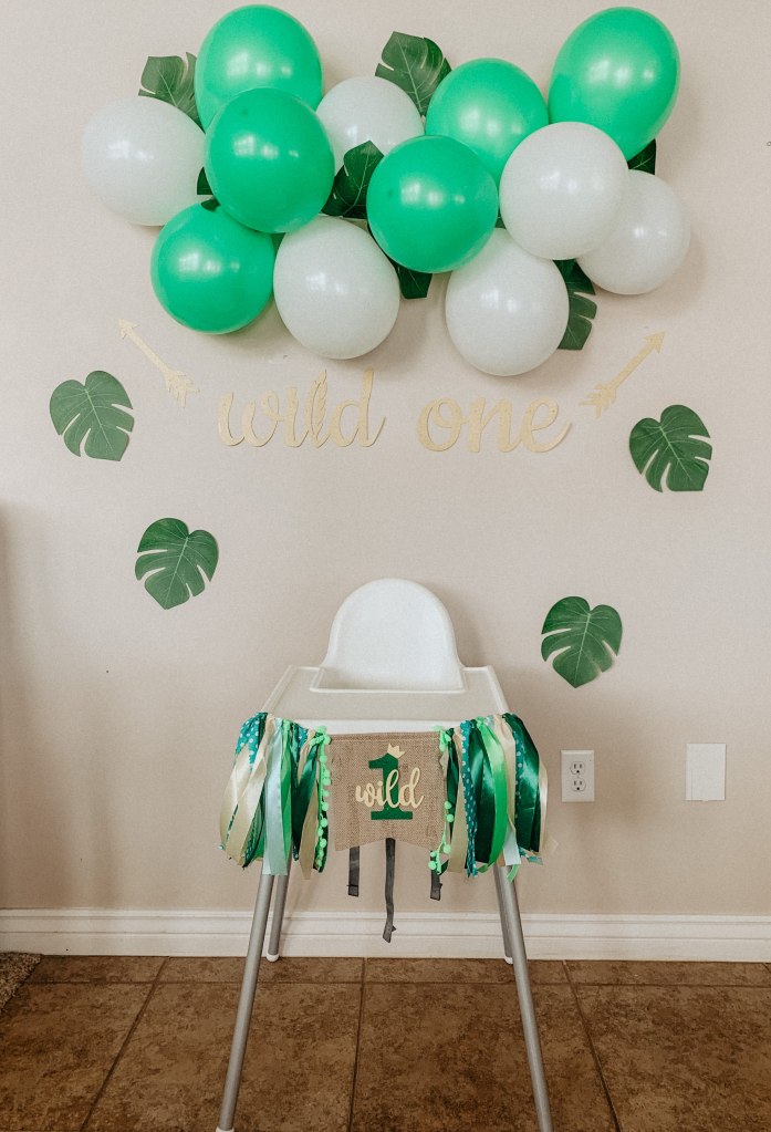 I was able to set up all of the food and decorations during Calvin’s mid-day nap. I blew up the twelve latex balloons and made a make-shift DIY balloon garland using the balloons, a string, and the paper leaves. Then I used Scotch tape to stick the “Wild One” sign and extra leaves to the wall, and tied the banner to an IKEA high chair. We also had the animal mylar balloons filled with helium at the grocery store.