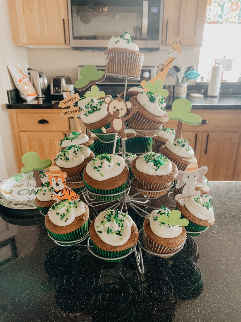 I made chocolate cupcakes with homemade cream cheese frosting and jungle sprinkles for us to eat. (It was actually my very first time making cupcakes!) I also served corn chips with salsa and guacamole, a vegetable tray with ranch dip, and grapes, apples, and strawberries with fruit dip. We also had ice water available. I decorated the cupcakes with jungle critters that came in the decor kit and stacked them on a cupcake tower.