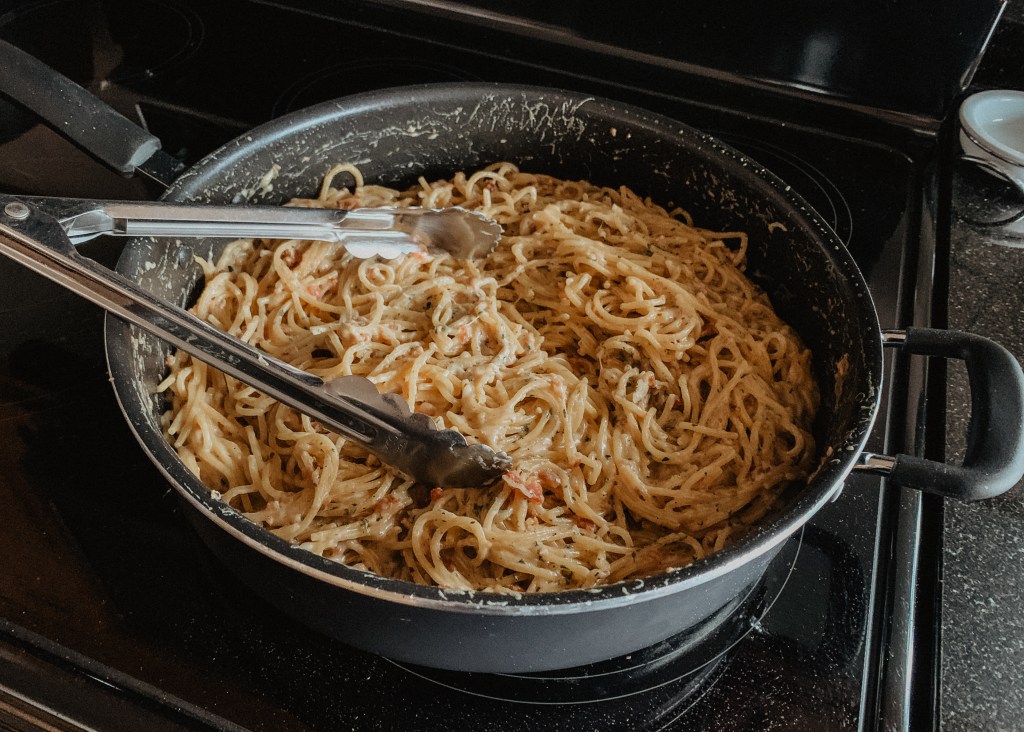 - Reduce heat and simmer, stirring occasionally, until pasta is cooked through and most of the liquid has cooked off