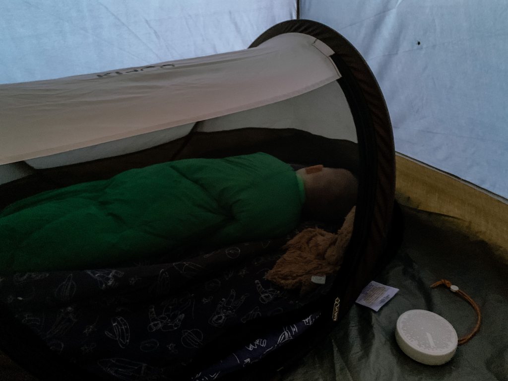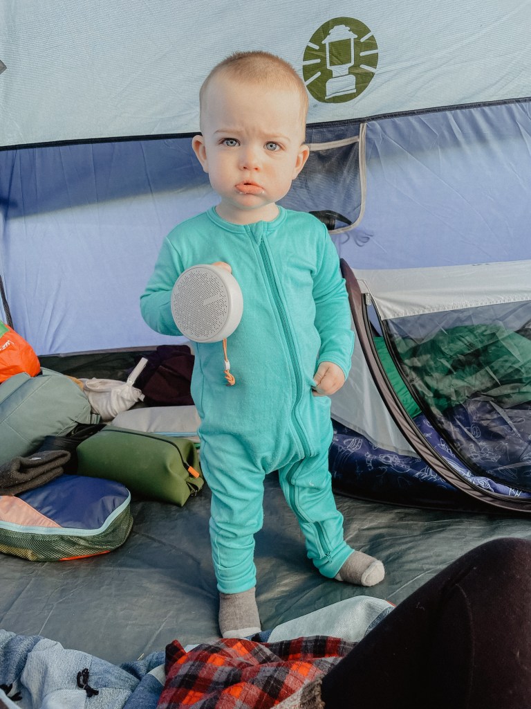 Calvin’s sleep area for camping was pretty basic, but pretty important. He slept in his Kidco Peapod. It has a mat attached to the bottom, so we didn’t worry about a sleeping pad. Inside the Peapod, there was a denim quilt, folded in half, flannel-side up that I made specifically to fit in the Peapod and give him a more comfortable sleep surface. When we laid him down to sleep at night, he wore his merino wool baselayer, wool socks, and his Little Mo 20° sleeping bag. It only dropped to about 42°F overnight, but the shipping on the Little Mo 40° I had ordered was delayed, so we worked with what we had. We gave his his lovey and binky and used the battery powered white noise machine. He slept all night long. (I, on the other hand, slept poorly. Which I expected being 4 months pregnant and sleeping on an air mat).