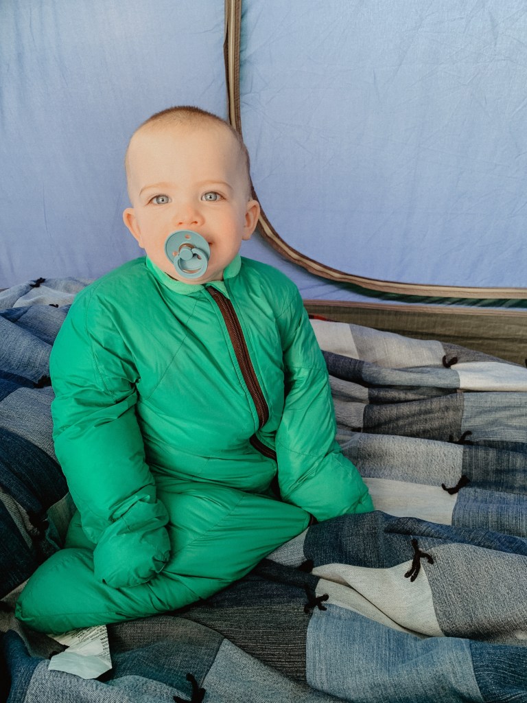 - Merino Wool Base Layer – this is definitely an investment piece for your little one, but if you plan on spending a lot of time outdoors, I think it’s worth it. Merino has this magical ability to keep you warm when the weather is cool, but keep you cool when the weather is warm. It’s also UV protectant. I have a zippered one-piece from Iksplor that Calvin sleeps and plays in when we are camping. It cost me $90. Merino isn’t cheap, so if you are looking for an alternative, look for non-cotton synthetic fabrics.