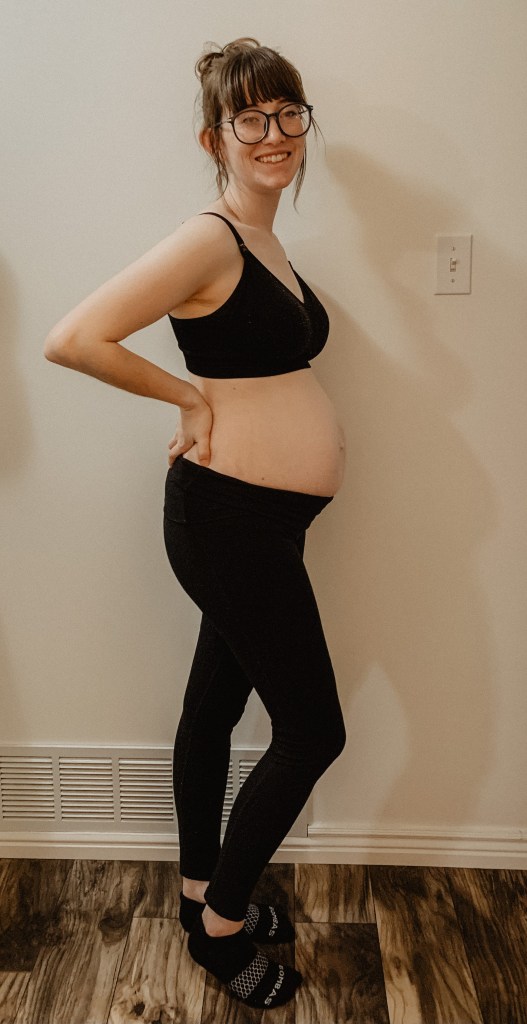 I wear these pants almost every single day. I’m a fan of leggings anyway, so be able to continue wearing my staples during pregnancy is my jam. These leggings are 7/8 length so they don’t bunch up at the bottom, they have pockets on either side that are big enough for my phone, and they offer so much support to my big belly and weak lower abdomen. I wear my regular (pre-pregnancy) size and they fit great throughout my pregnancy.