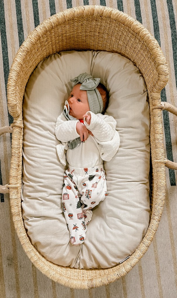 - Moses Basket – with Calvin, we had a swing, a bouncer chair, a Bumbo, and a Rock N’ Play (now recalled) but we almost always just laid him on a blanket on the floor because it was easier and we could put him anywhere. However, we didn’t have to protect him from a toddler. For that reason, I purchased a Moses basket from an Etsy seller in Ghana that would fit our SnuggleMe Organic lounger. I can lay and carry Della in this basket anywhere I need her to be, and she is protected from Calvin as he goes about his play. Della also takes all of her daytime naps in the Moses basket. This basket has seriously saved my bacon with two kids under two years old in a tiny apartment. And, if I ever have a spring or summer baby, this basket will be perfect for taking them outside with us to enjoy the fresh air and sunshine.