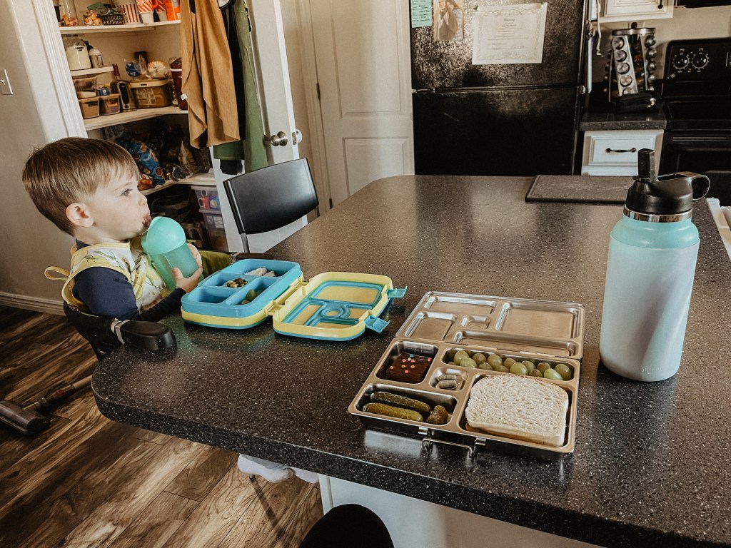 Just knowing what food I need to be prepared for the next day is immensely helpful for me. It can be overwhelming for me to try and figure out what to feed Calvin for a meal while he’s clinging to my leg and Della is crying in the background. I love just being able to pull both of our lunches out of the fridge and immediately serve them. Also, when I pack them the night before, I find that I am much more able to have a balance in his food options, rather than accidentally serving him four different kinds of fruit and no fats or protein for lunch.