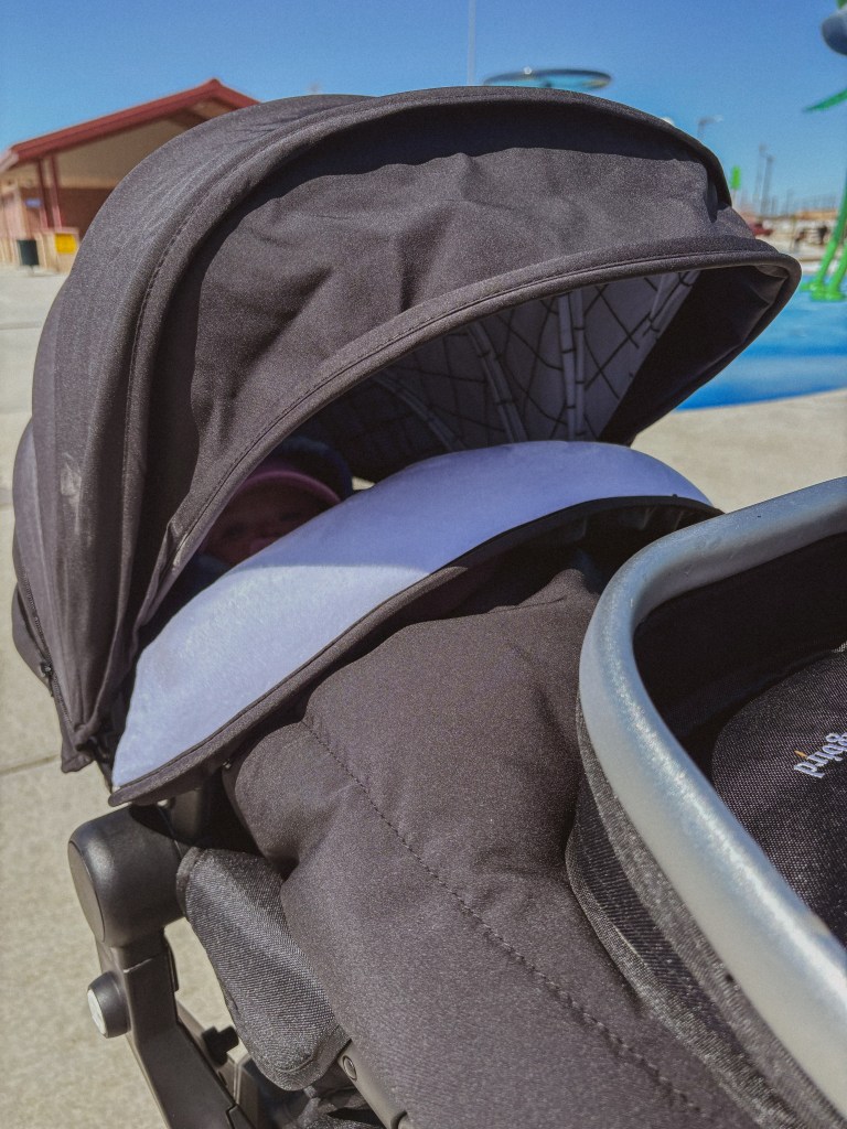 - Interchangeable Canopies – I just recently discovered this option, but the colored canopies on the stroller (mine are black in these pictures) are interchangeable! You can purchase additional canopies on the Mockingbird website to change up the look of your stroller or even mix and match! The canopies have also been updated to extend even farther, offering your child more breathable shade (even with the seat reclined).