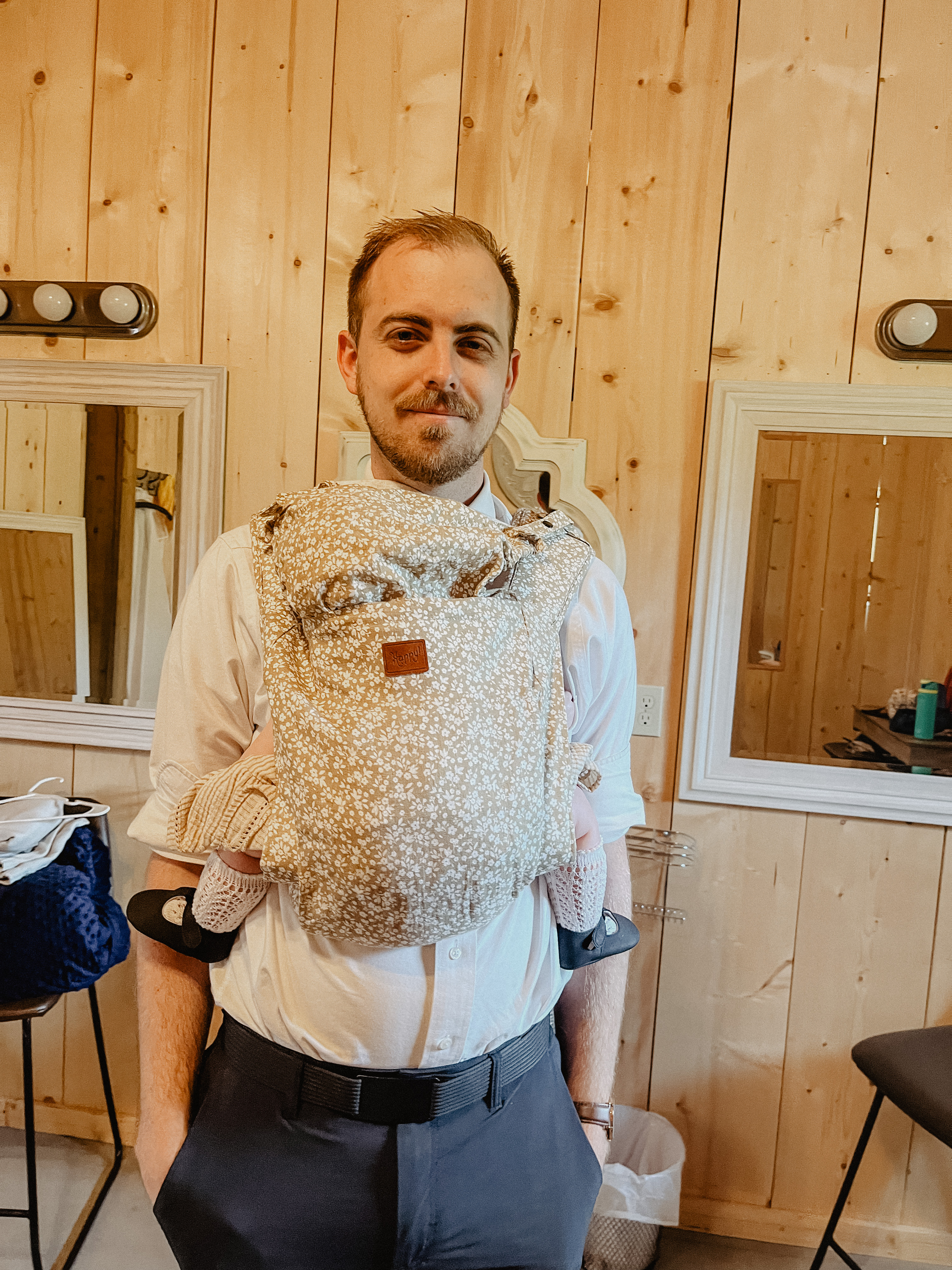As for Della, once the ceremony and pictures were over, anytime she wasn’t happily being held by a family member she was being worn in a carrier. I brought our Happy Baby Onbuhimo carrier and our Hope&Plum ring sling to the wedding and it was great. The Onbuhimo I have is a beautiful tan color with a flower print on it, so it actually matched the wedding colors decently. We brought two carriers because the Onbuhimo is the one Della most likes to sleep in and the ring sling is the easiest for me to discreetly nurse Della in. Della took all of her naps in the carrier, but I didn’t end up needing the ring sling at all because I was able to nurse Della on the couch in the air-conditioned Bride’s Room every time she got hungry.