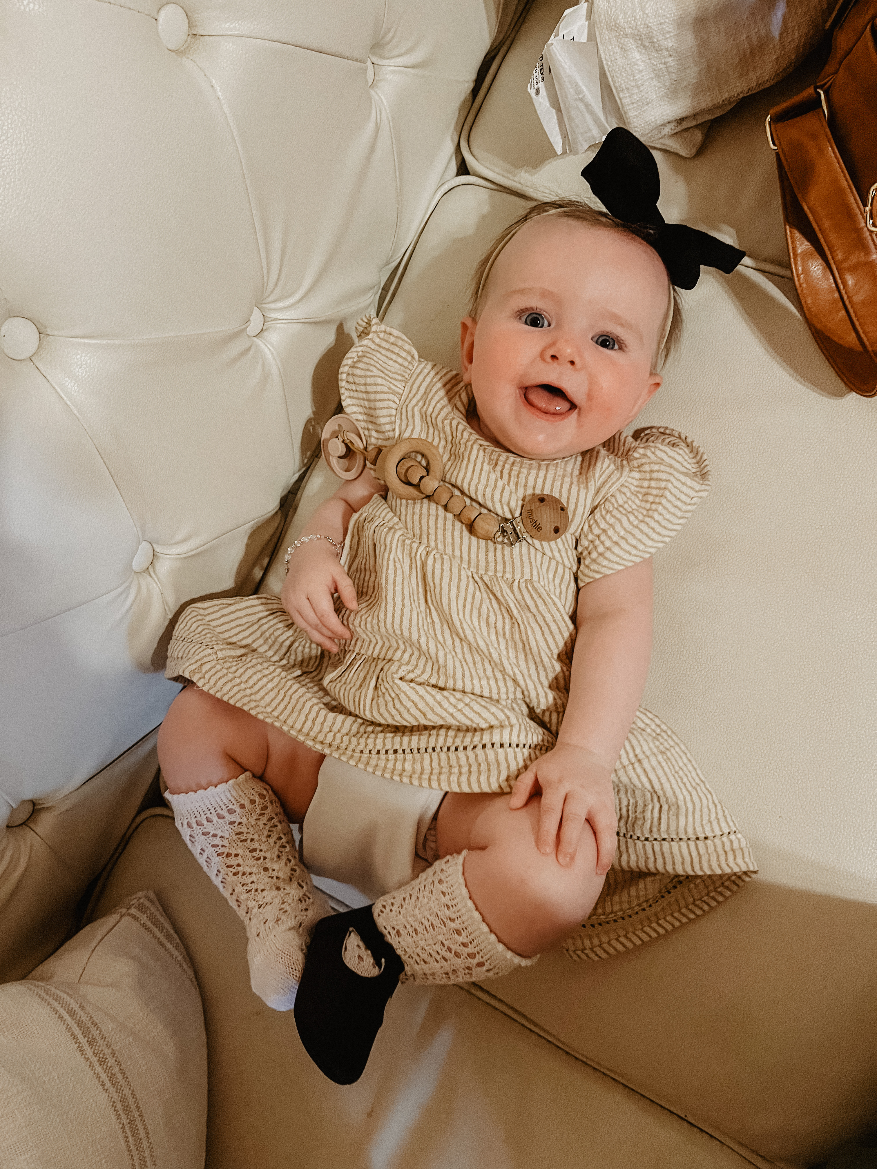 Before leaving, we got Calvin all dressed and ready, but not Della. Della has this amazing ability to blow out of her diaper onto her nice clothes the second we arrive at a family event. It happened at my cousin’s homecoming, when we celebrated my birthday with family, on Mother’s Day, on Memorial Day, and numerous other times. So we just brought Della in a plain onesie and changed her into her wedding clothes at the venue. We also added a cloth diaper ”outer” over her regular diaper to prevent any blowout from getting on her clothes. And we packed an extra outfit for her just in case.