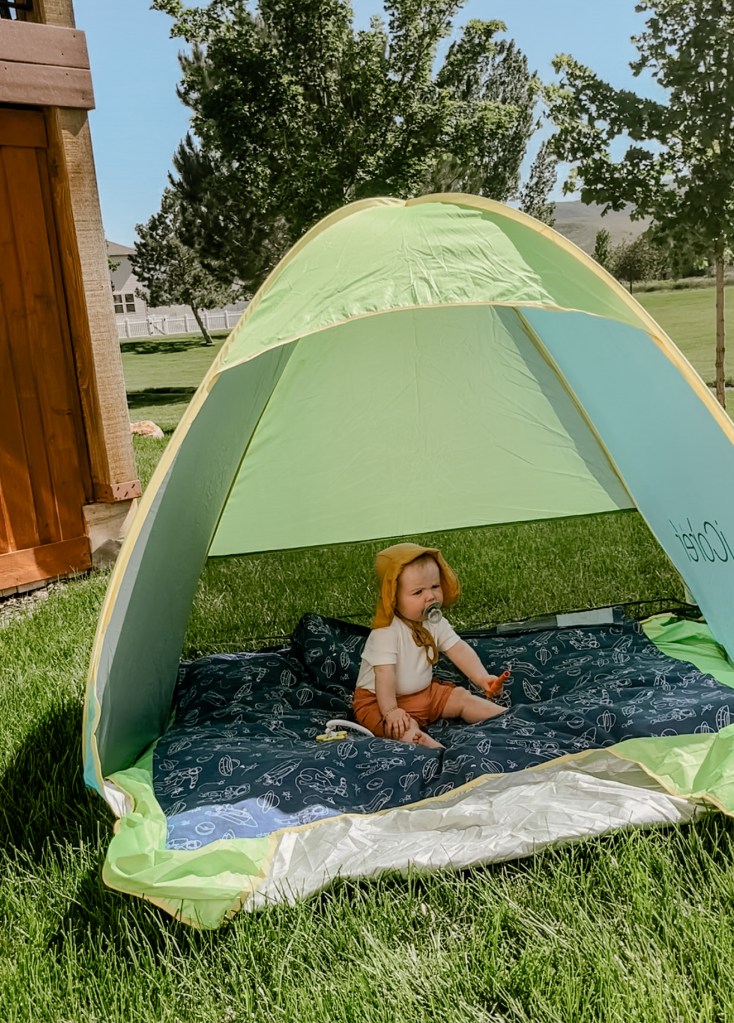 I have two shade tents that I use for the kids in different scenarios. If I want an enclosed space for just Della to lie in while I’m helping Calvin on a playground or setting up camp or something similar, then I use one of our KidCo PeaPod pop-up tents (read my full review here). It’s a great size to lay my baby in, it zips up completely to keep her protected from bugs, dirt, or rolling away, and it doubles as a great bed when we are tent camping.